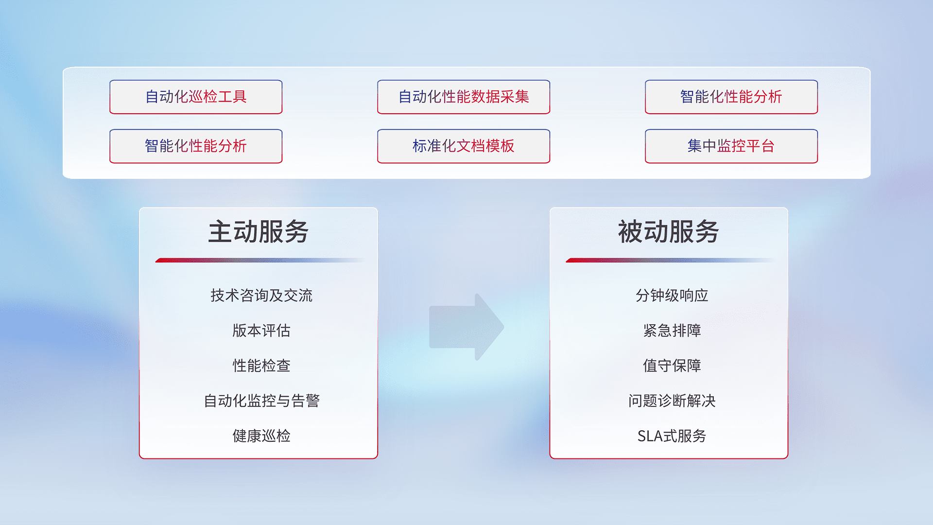 智能化工具和标准化文档,,,,保障服务质量,,提供主动服务(包含技术咨询、、版本评估、、性能检查、、、、自动化监控与告警、、、、健康巡检)和被动服务包含(分钟级响应、、紧急排障、、、值守保障、、、问题诊断解决、、SLA服务)。。。